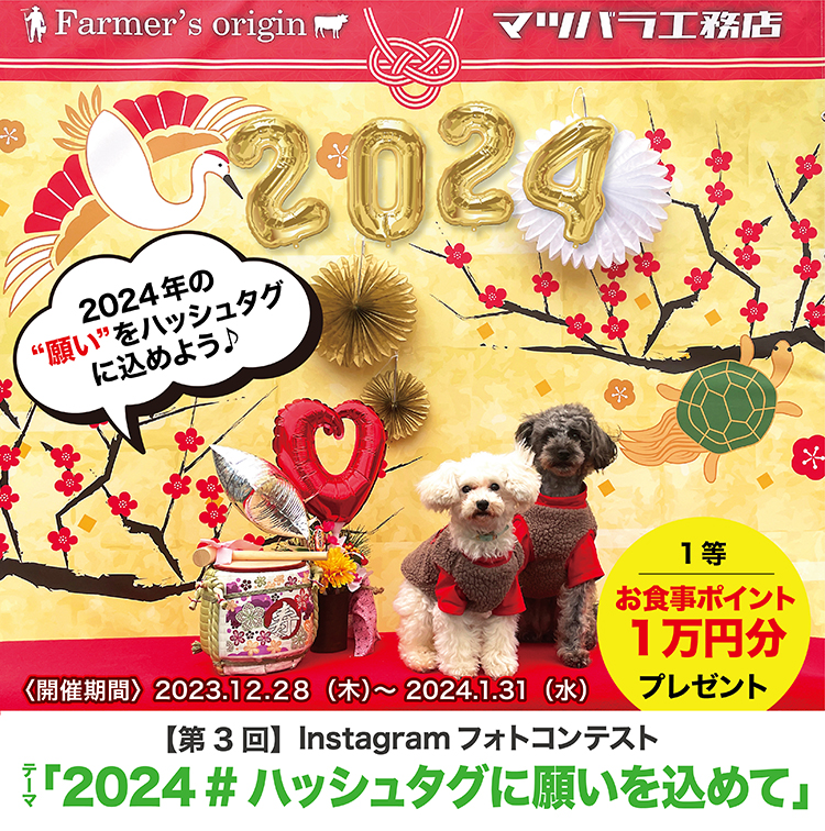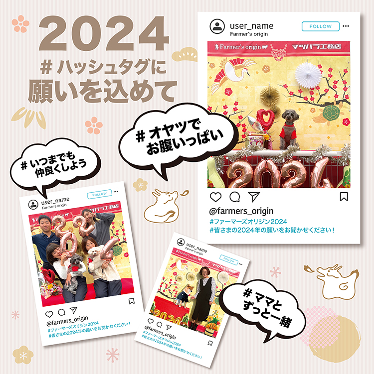 期間中に店舗前の特設バックパネルの前で撮影して、インスタグラムでハッシュタグに2024年の願いを書き込んで、公開投稿しょう。