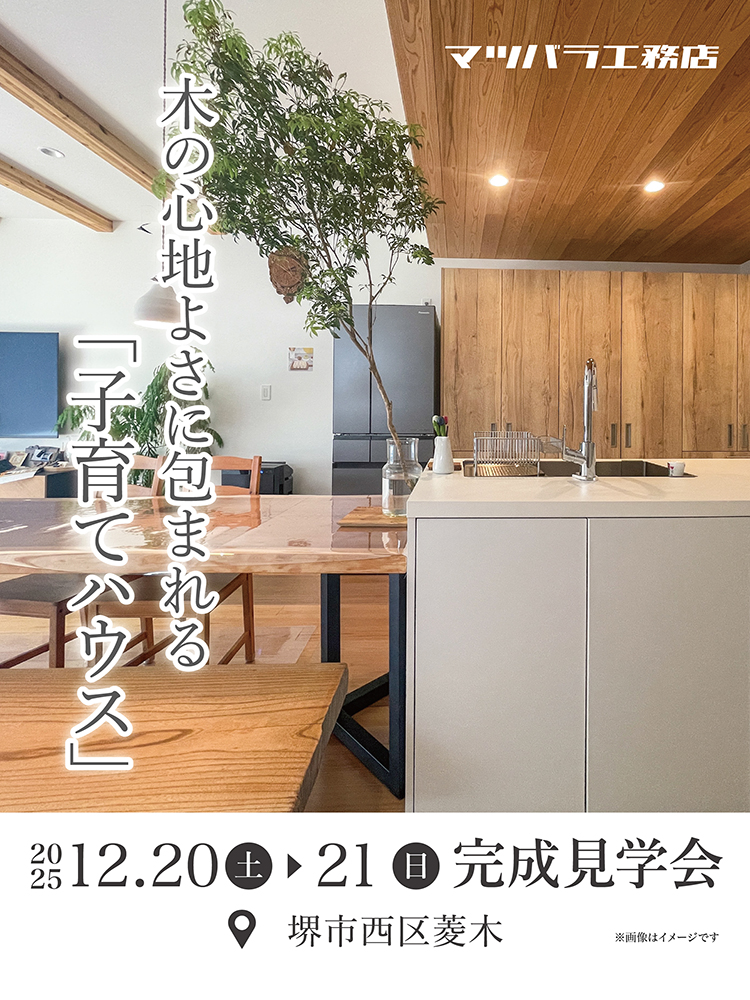 EVENT [木の心地よさに包まれる子育てハウス]完成見学会 開催日時 2025年12月20日(土)・21日(日) 10:00/12:00/15:00▶予約制 (会場:[木の心地よさに包まれる子育てハウス]完成見学会) 詳しくはこちら > 会場 [木の心地よさに包まれる子育てハウス]完成見学会 会場住所 堺市西区菱木※お申し込み後に、現地住所をお送りいたします 開催日時 2025年12月20日(土)・21日(日) 10:00/12:00/15:00▶予約制 参加費 無料 定員 各回1組 アクセスマップを確認する >> Application お申し込みはこちらから 次の記事 一覧へ戻る
