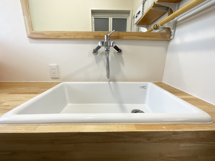 洗面台のコーディネイトです。自宅でトリミングしたいので、広さ深さもバッチリな医療用シンクに、シャワー付きの水栓をあわせました。カウンターは松原工務店さんの造作です。こういう自由度の高い設備が叶うのがうれしかったです。壁に棚下地をいれてもらって、棚は住んでから自分で取り付けてDIYしています。それとキッチンは、窓を全面なしにするかわりに換気扇2台の設置を提案してもらいました。食品を扱う面で外部から虫が入る事がなく、深夜に仕込みをしていても部屋の明かりが漏れず、ご近所にご迷惑にならないので正解でした。