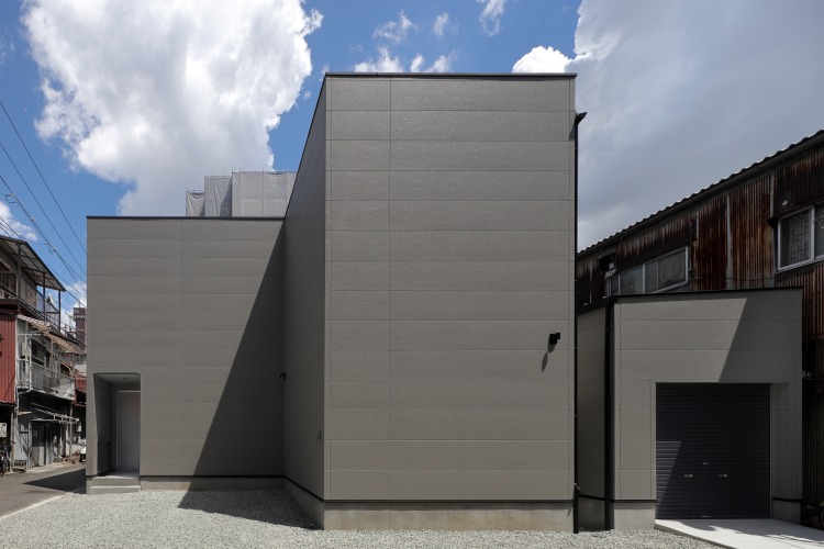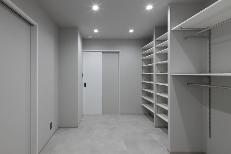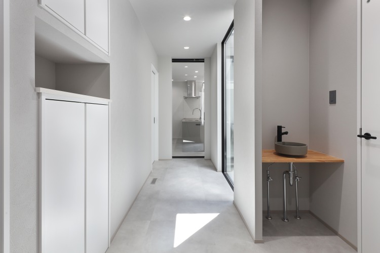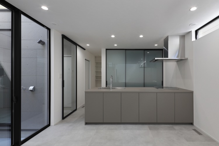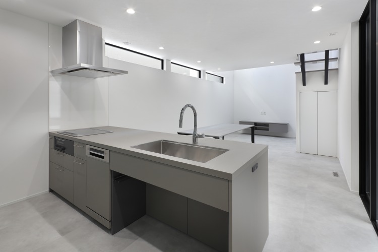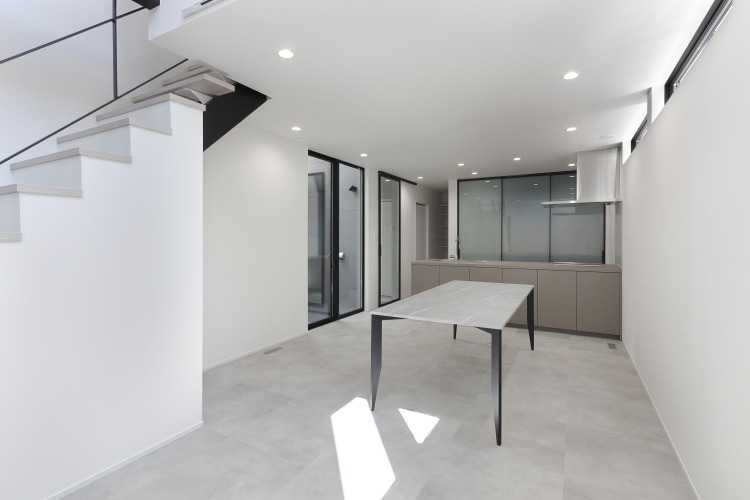 窓のない外観デザインは、唯一無二の存在感を発揮しています。 外観とのギャップに感動するほど、室内は明るグレーで統一されたスタイリッシュな空間となっています。